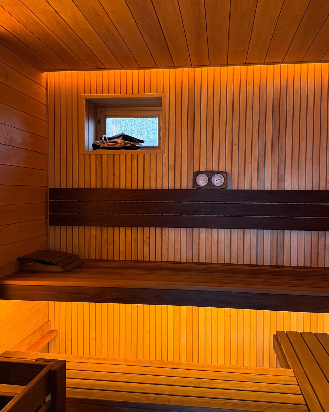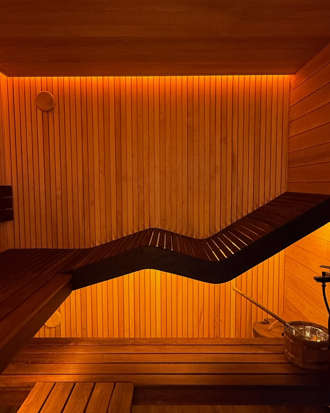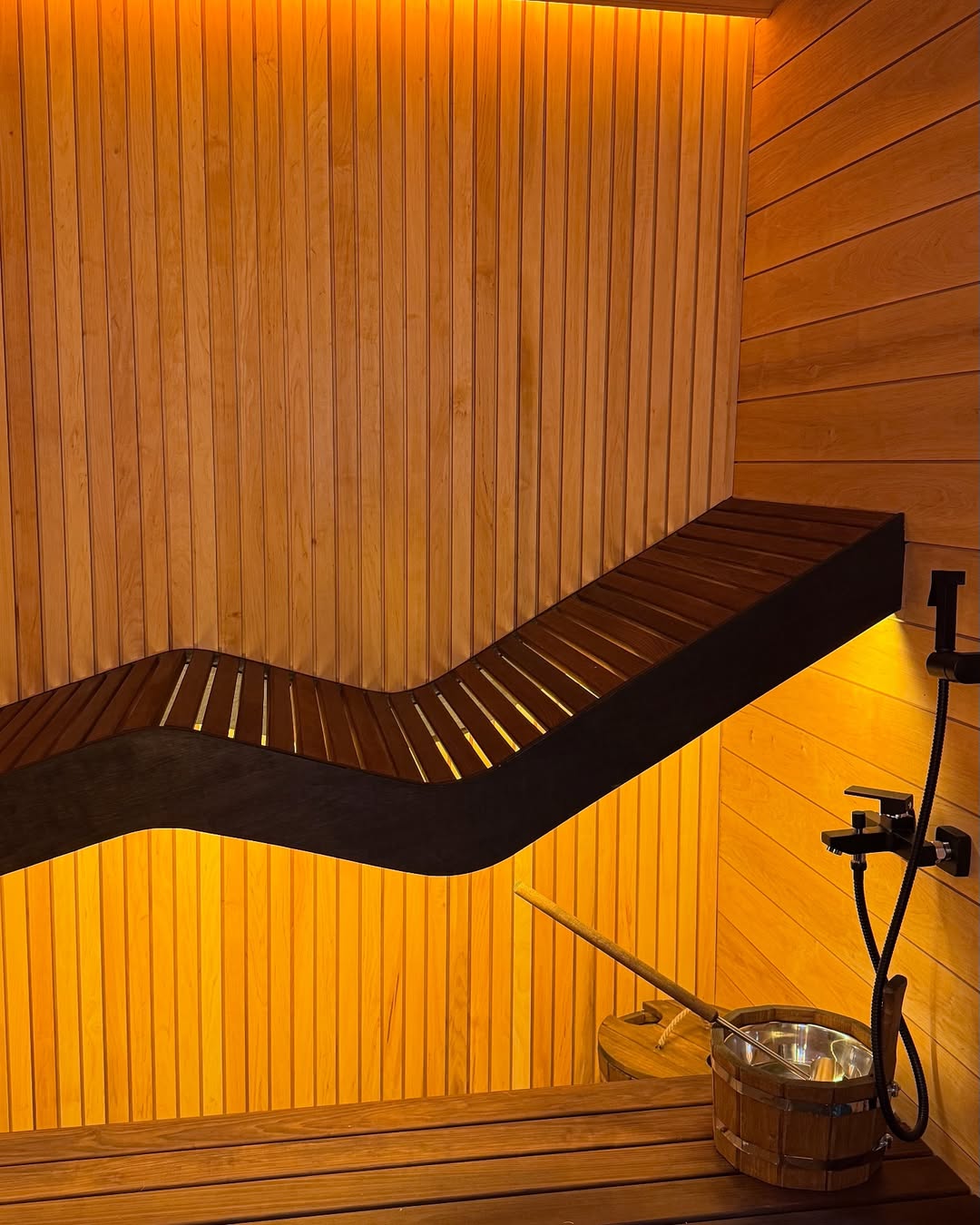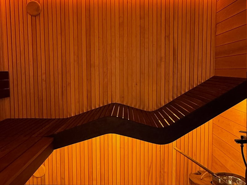 Материалы отделки:Вагонка STS из ольхи, 15/80Полок из термо липы, 26/90Элементы дизайна:Контурная подсветка.Плитка талькохлорит.Панно из можжевельника.Оборудование:Печь Я..