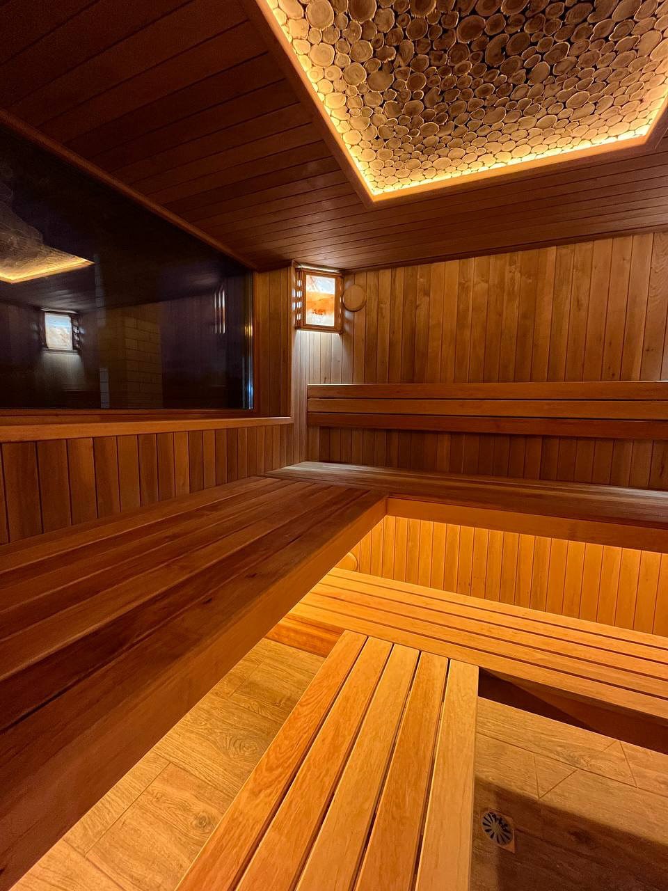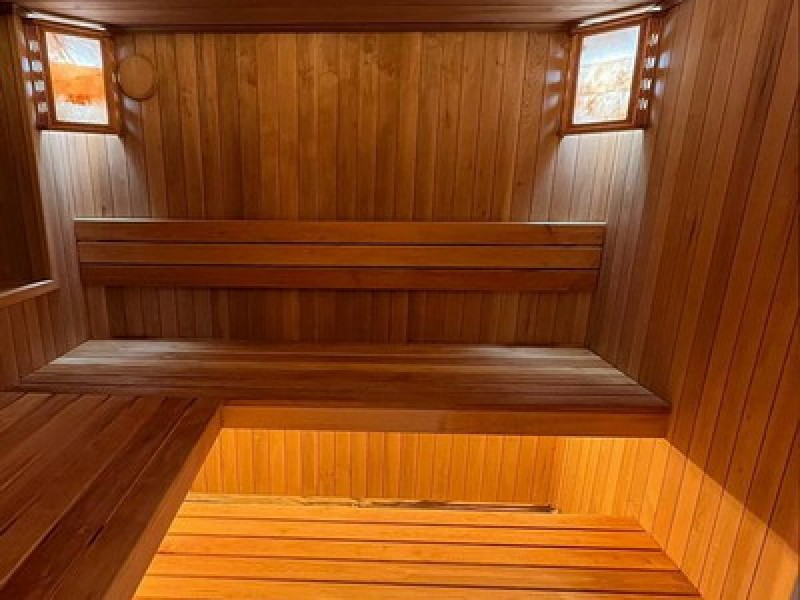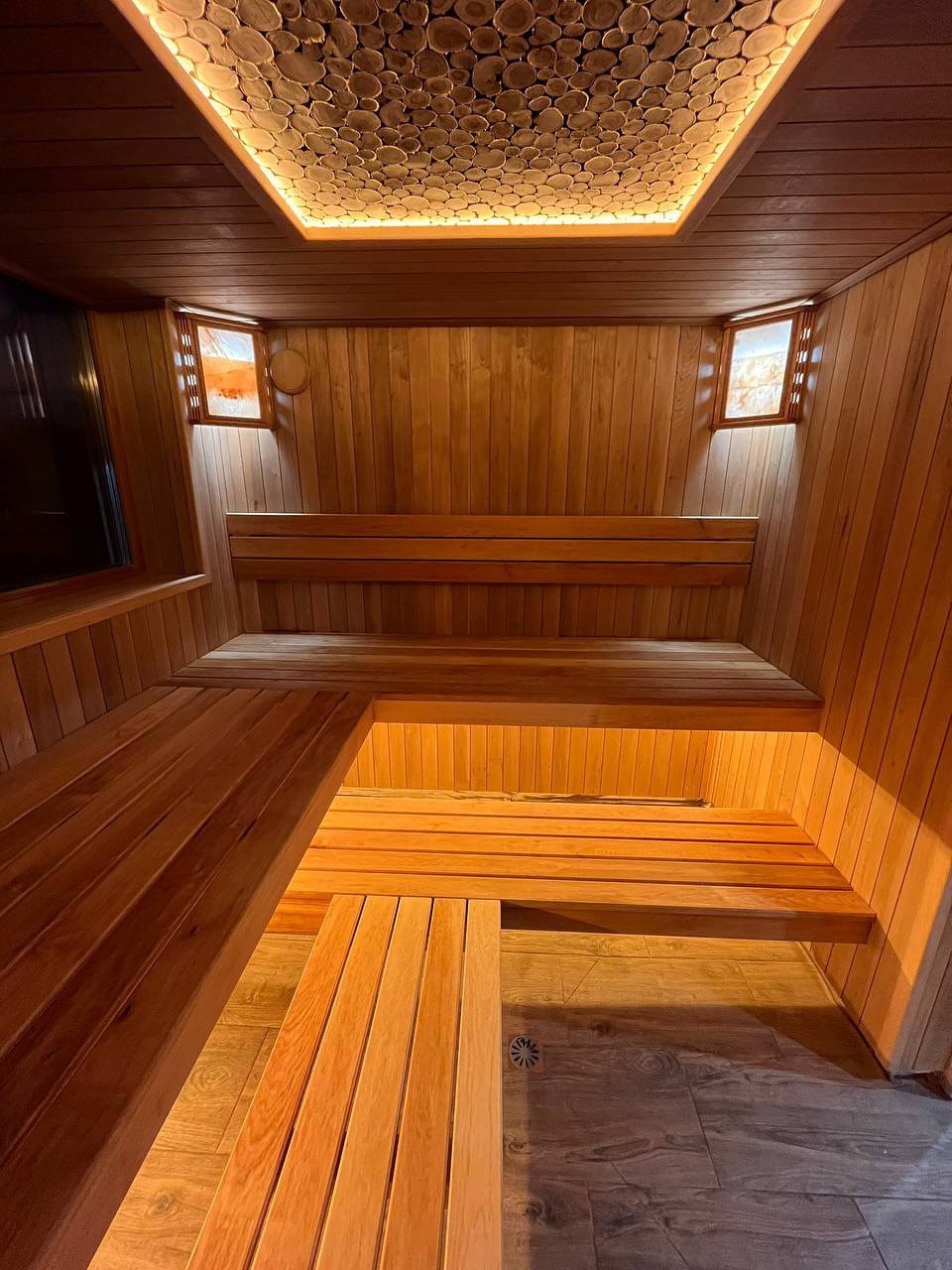 Материалы отделки:Вагонка реечная Макс из ольхи, 27/45;Вагонка STS из ольхи, 15/120;Полок из термо липы, 26/85.Элементы дизайна:Термосветодиодная подсветка.