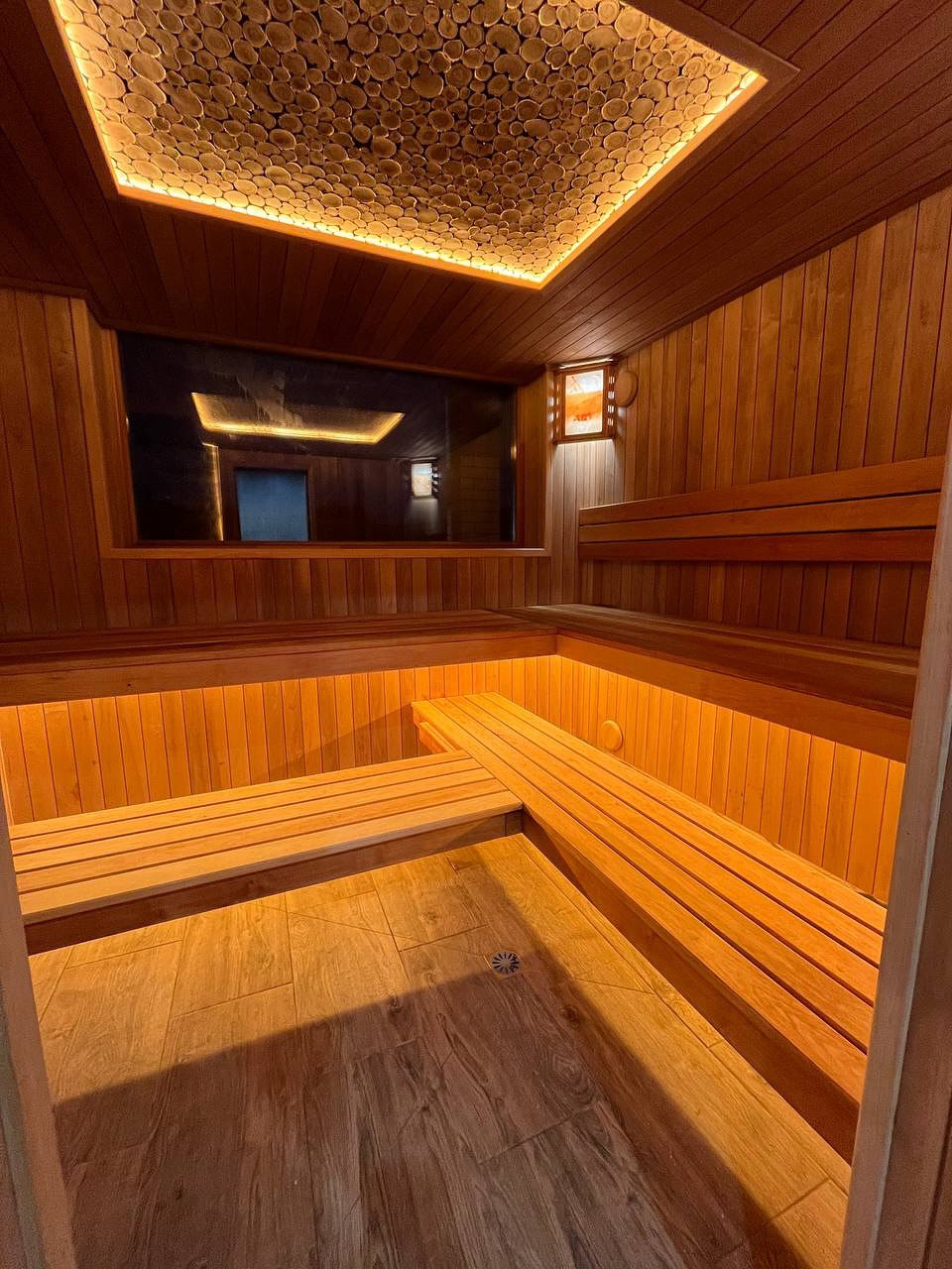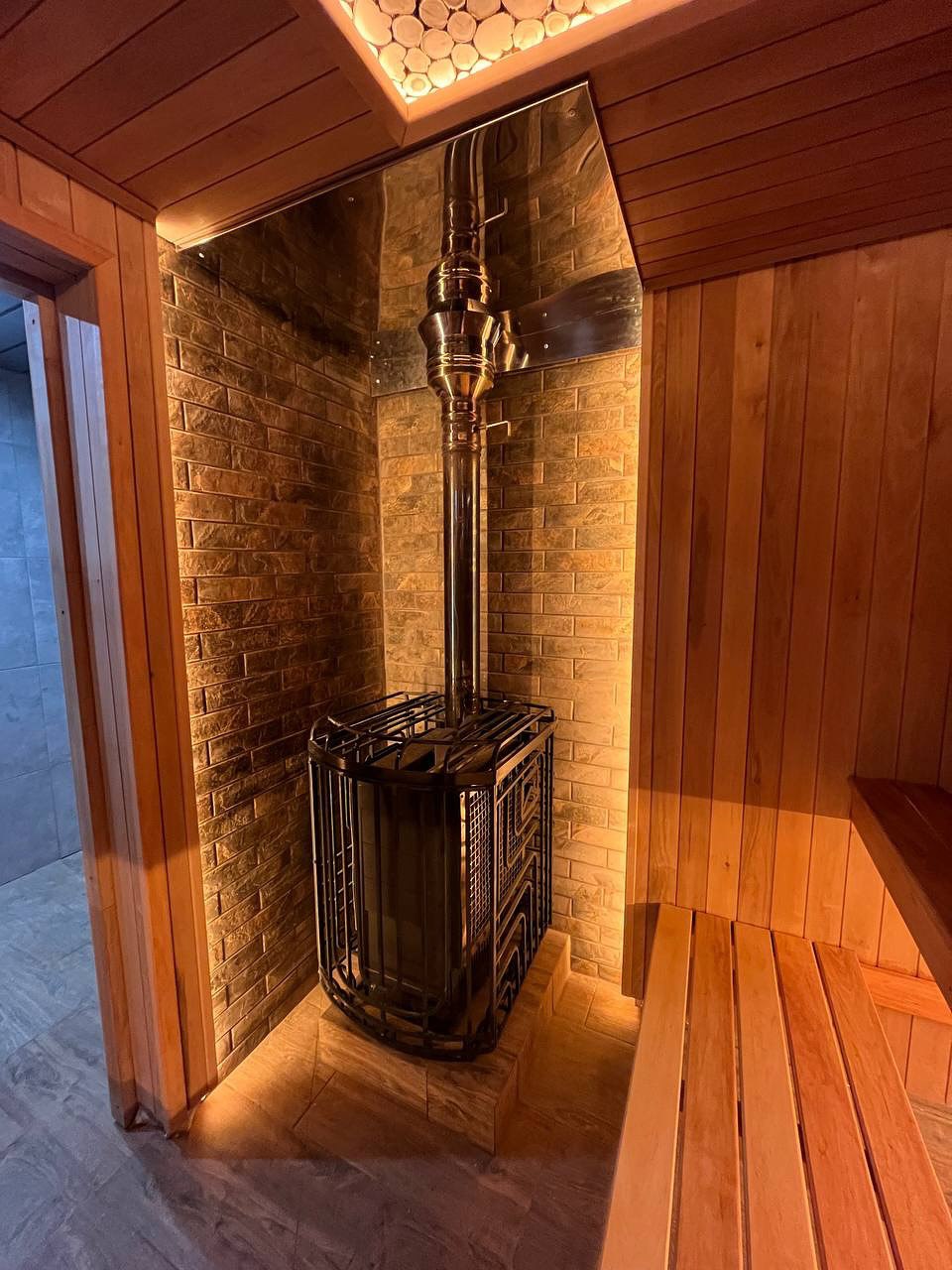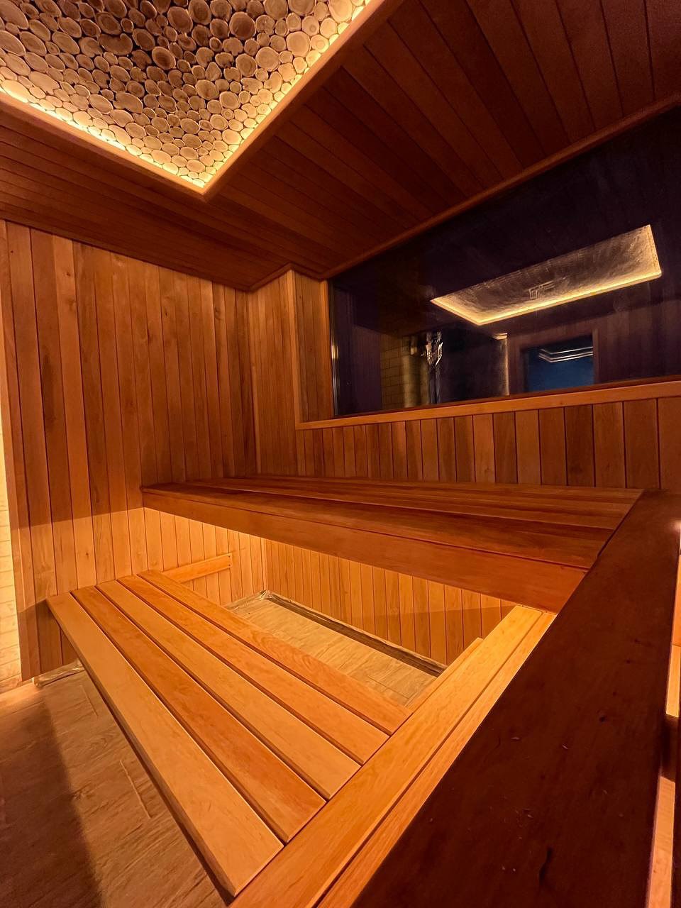 Материалы отделки:Вагонка STS из ольхи, 15х120,Вагонка реечная Лайт из ольхи,Полок из термо абаша.Элементы дизайна:Панно из можжевельника,Контурная подсветка,Плитка Тальк..