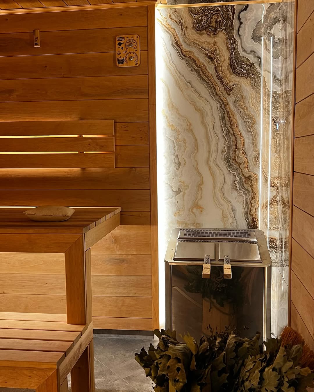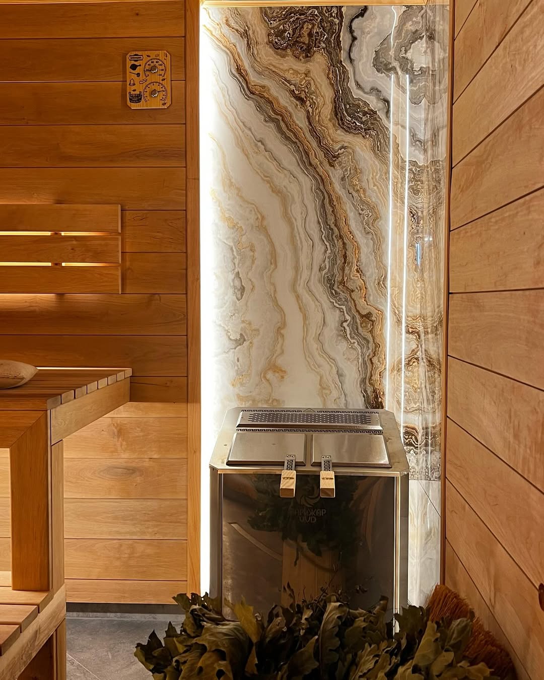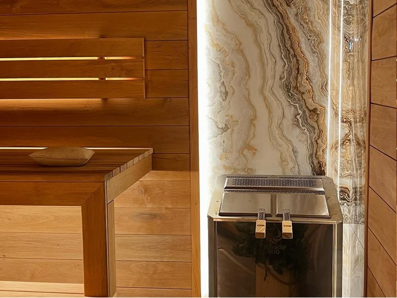 Материалы отделки:Вагонка STS из ольхи, 15*80 мм.Полок из ольхи, 26*90 мм.Элементы дизайна:Светодиодная лента.Гималайская соль.Панно из можжевельника 3D.Плитка талькохлор..