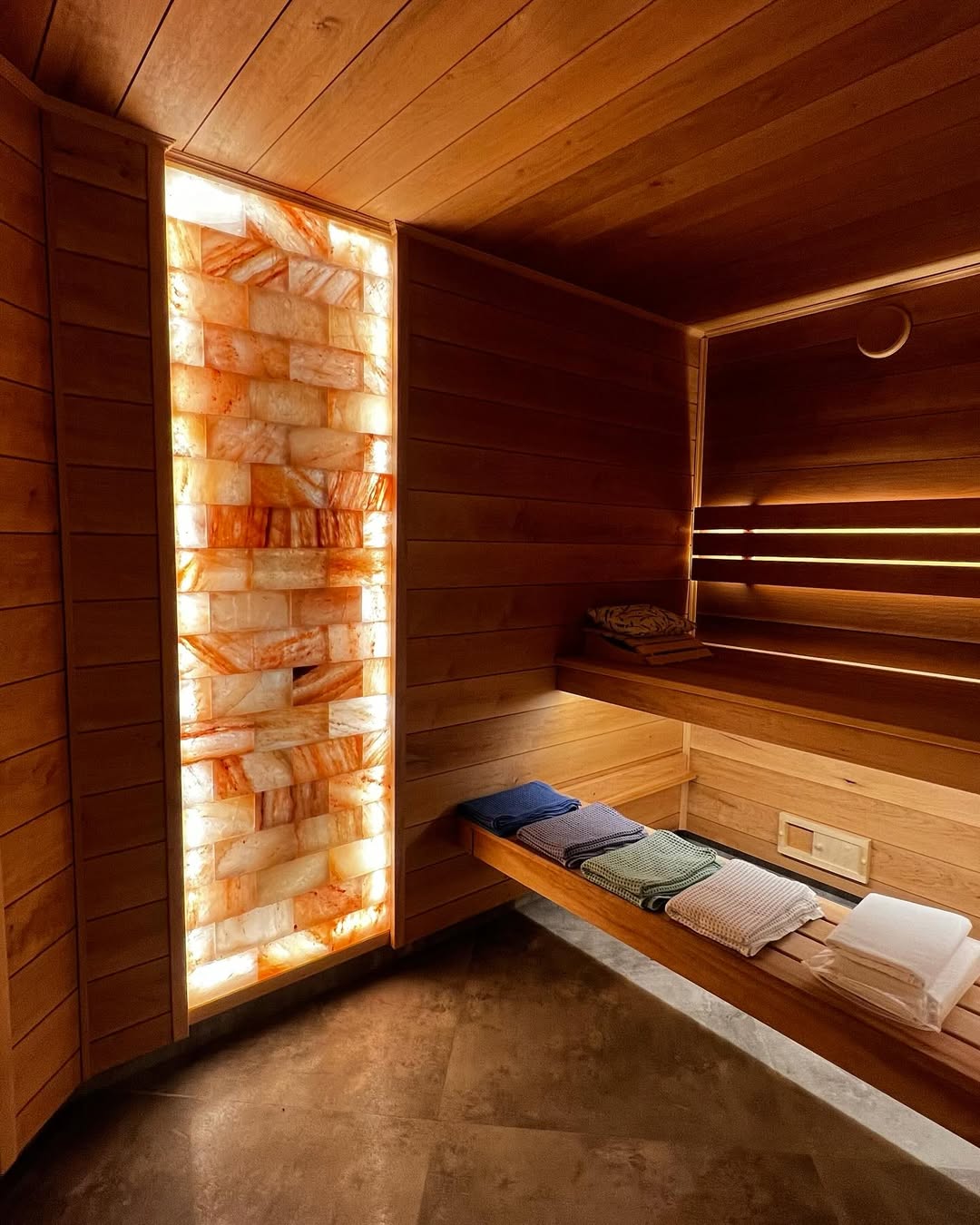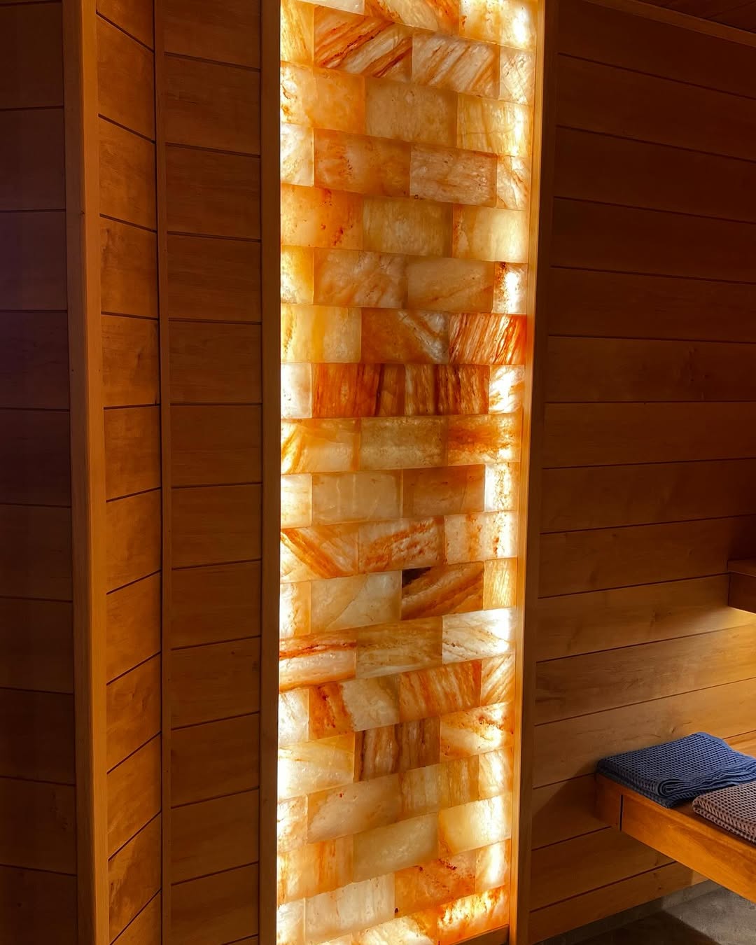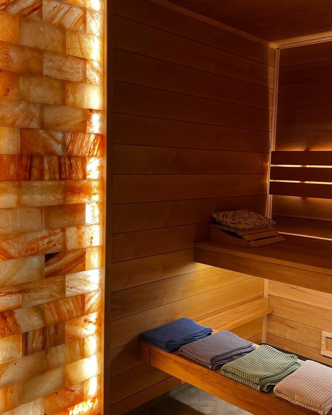 Материалы отделки:Вагонка STS из ольхи, 15*80 мм.Полок из ольхи, 26*90 мм.Элементы дизайна:Светодиодная лента.Гималайская соль.Панно из можжевельника 3D.Плитка талькохлор..