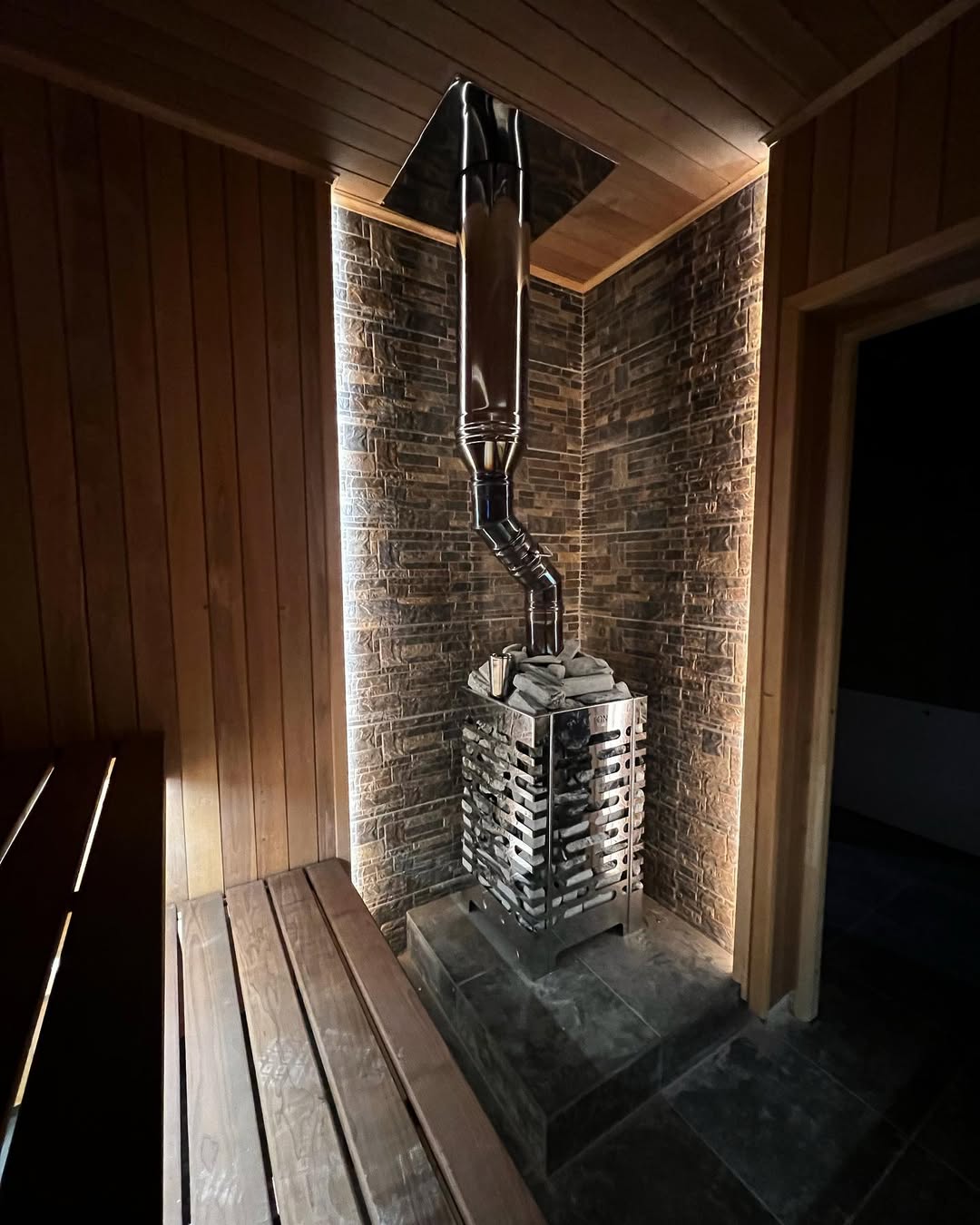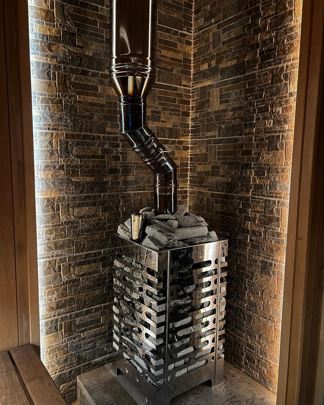 Материалы отделки:Вагонка STS из термо ольха, 15/115,Полок из термо ольхи, 27/120.Элементы дизайна:Панно из можжевельника,Плитка талькохлорит за печью.