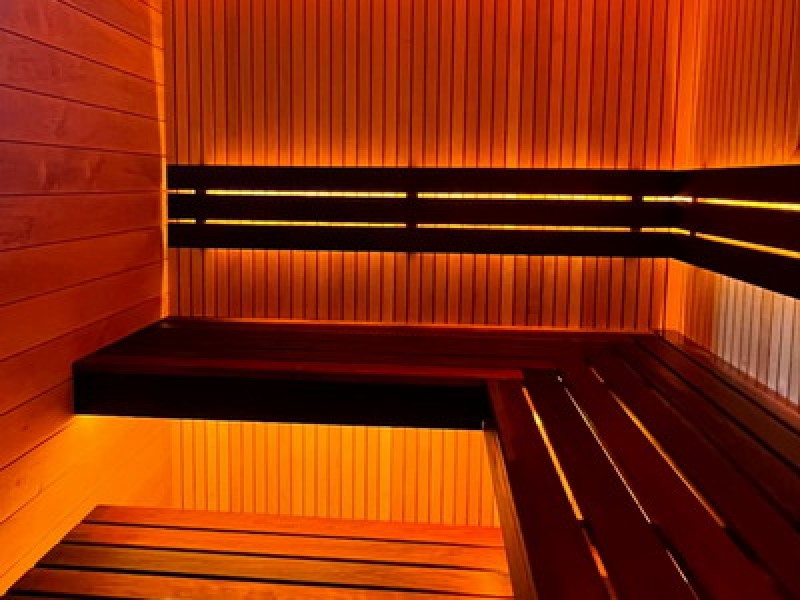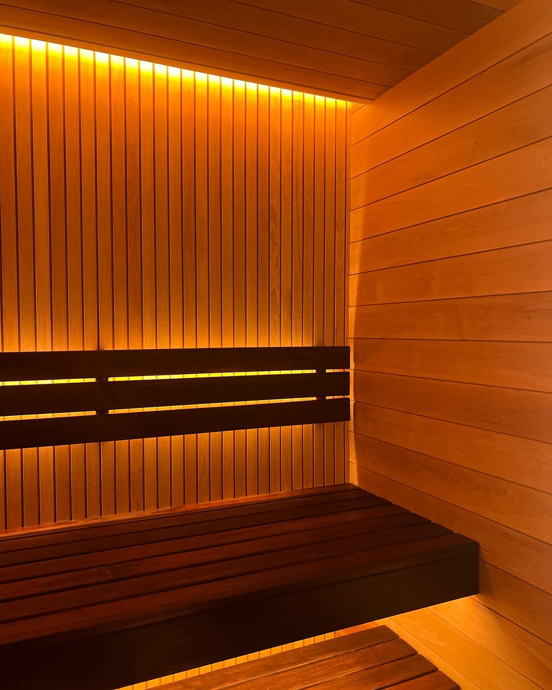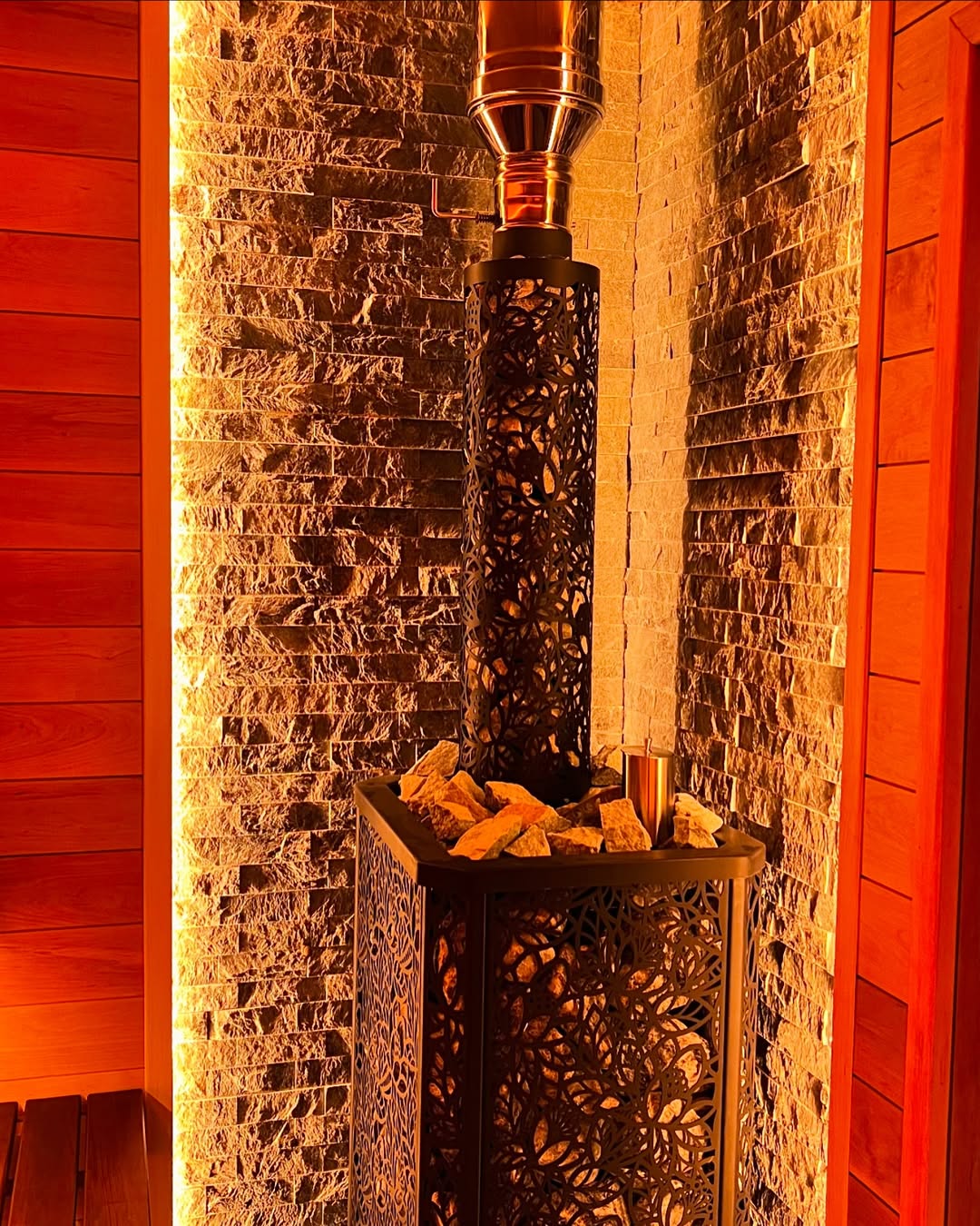 Материалы отделки:Вагонка STS из ольхи, 15*80 мм.Полок из ольхи, 26*90 мм.Элементы дизайна:Светодиодная лента.Гималайская соль.Панно из можжевельника 3D.Плитка талькохлор..