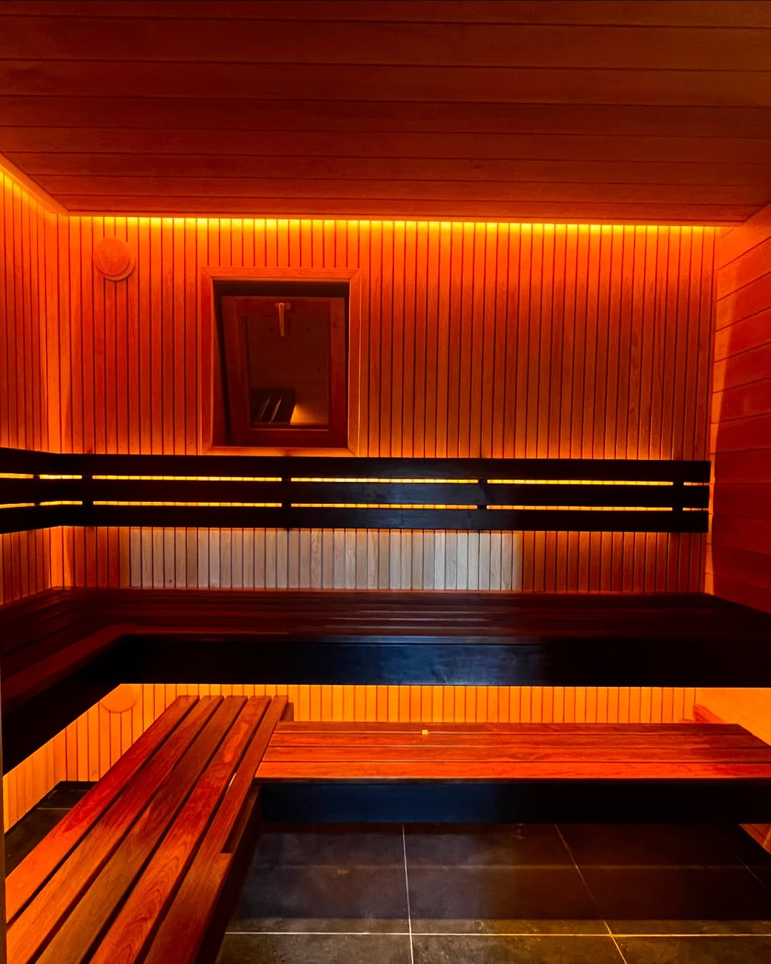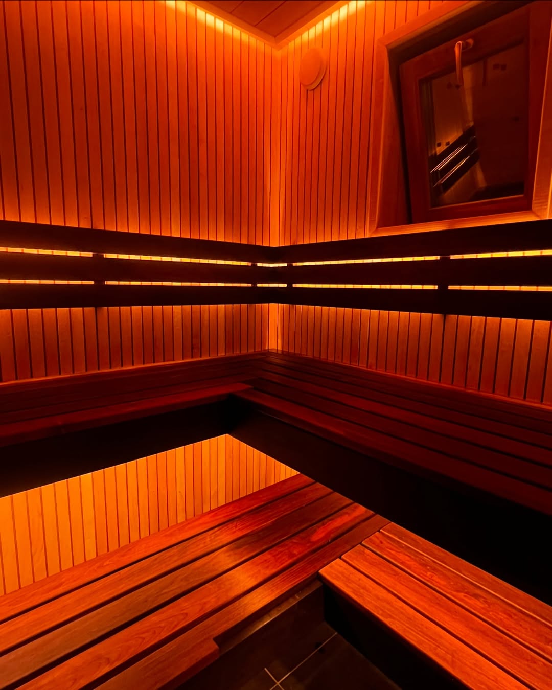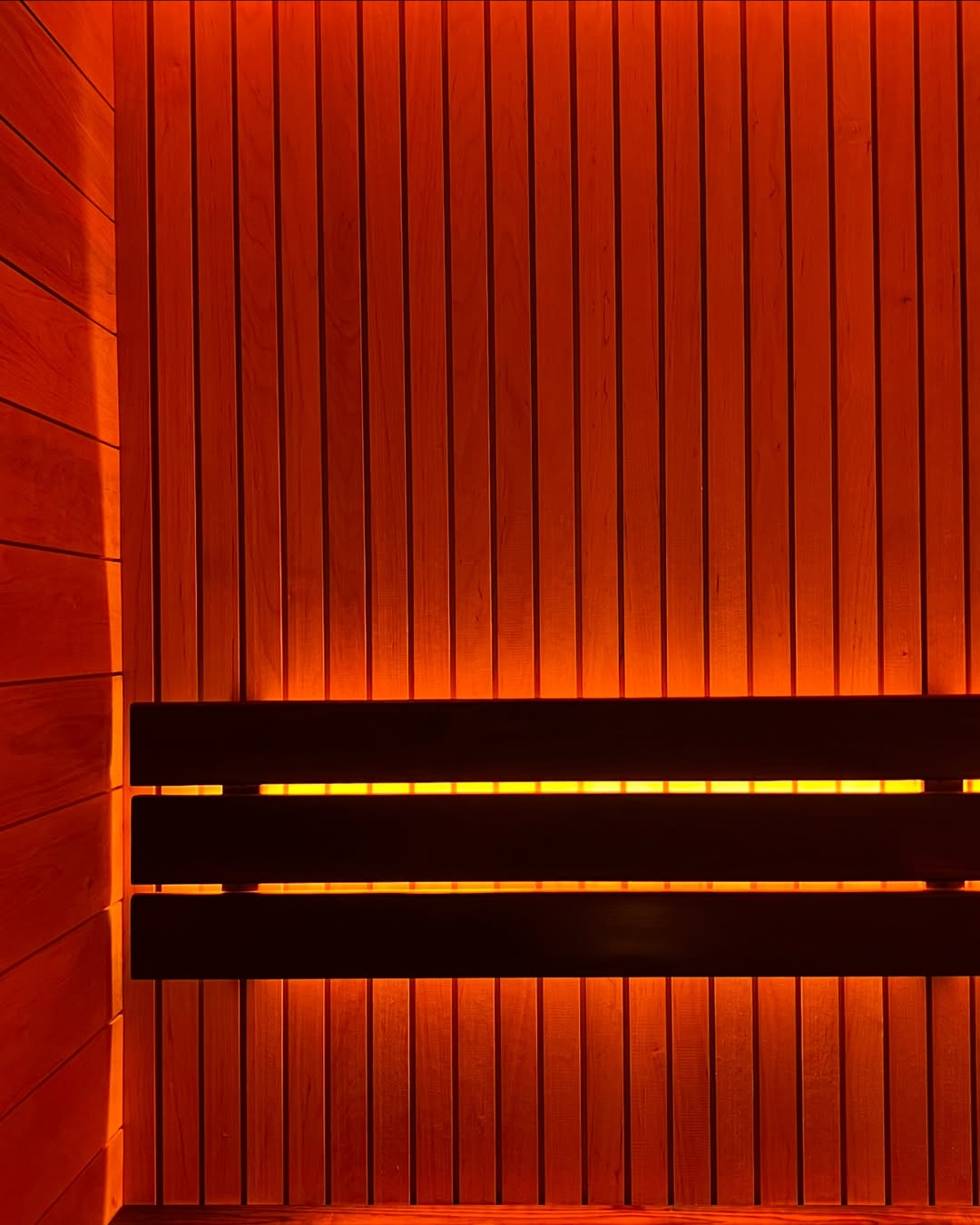 Материалы отделки:Вагонка STS из ольхи, 15*80 мм.Полок из ольхи, 26*90 мм.Элементы дизайна:Светодиодная лента.Гималайская соль.Панно из можжевельника 3D.Плитка талькохлор..