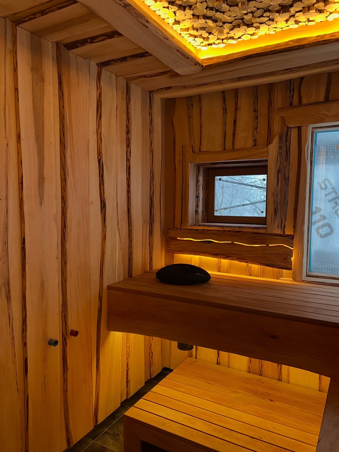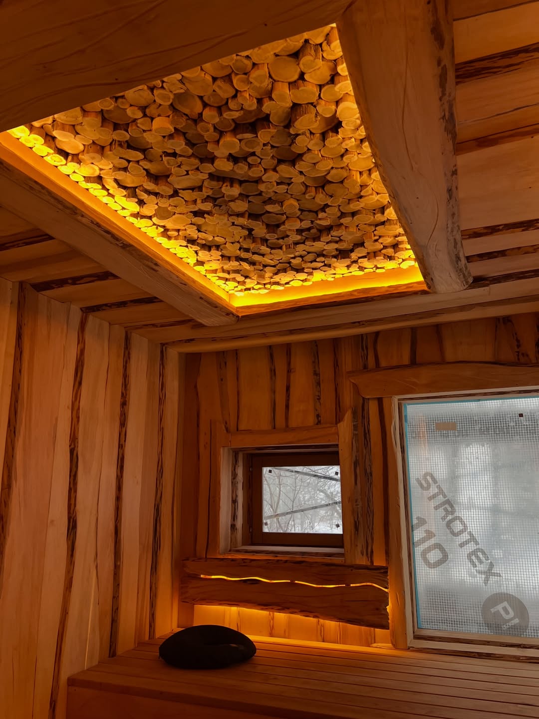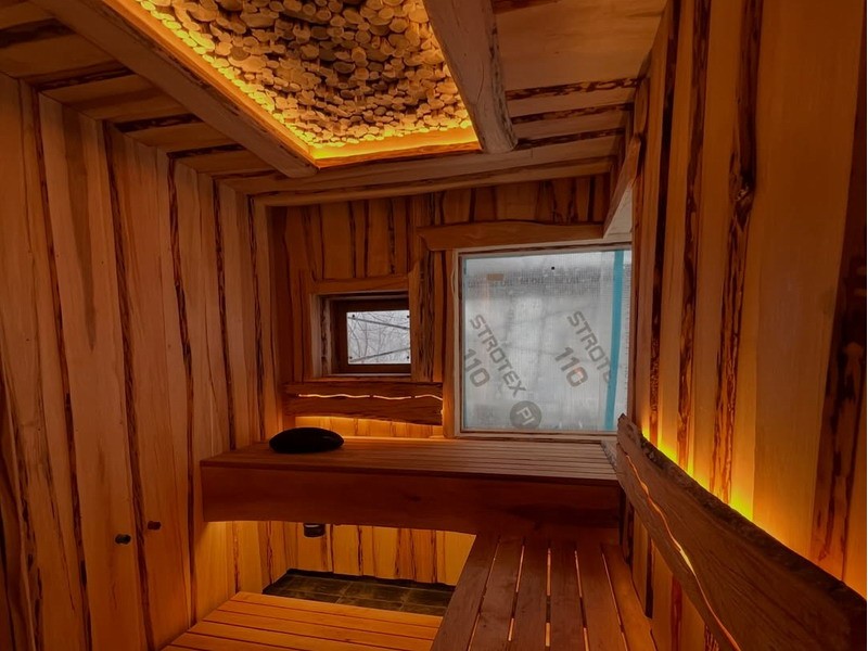 Материалы отделки:Вагонка реечная Лайт из ольхи, 15*61.Вагонка из термо липы, 15*96(88).Полок из термо липы, 26*90.Элементы дизайна:Контурная подсветка.Панно из можжевель..