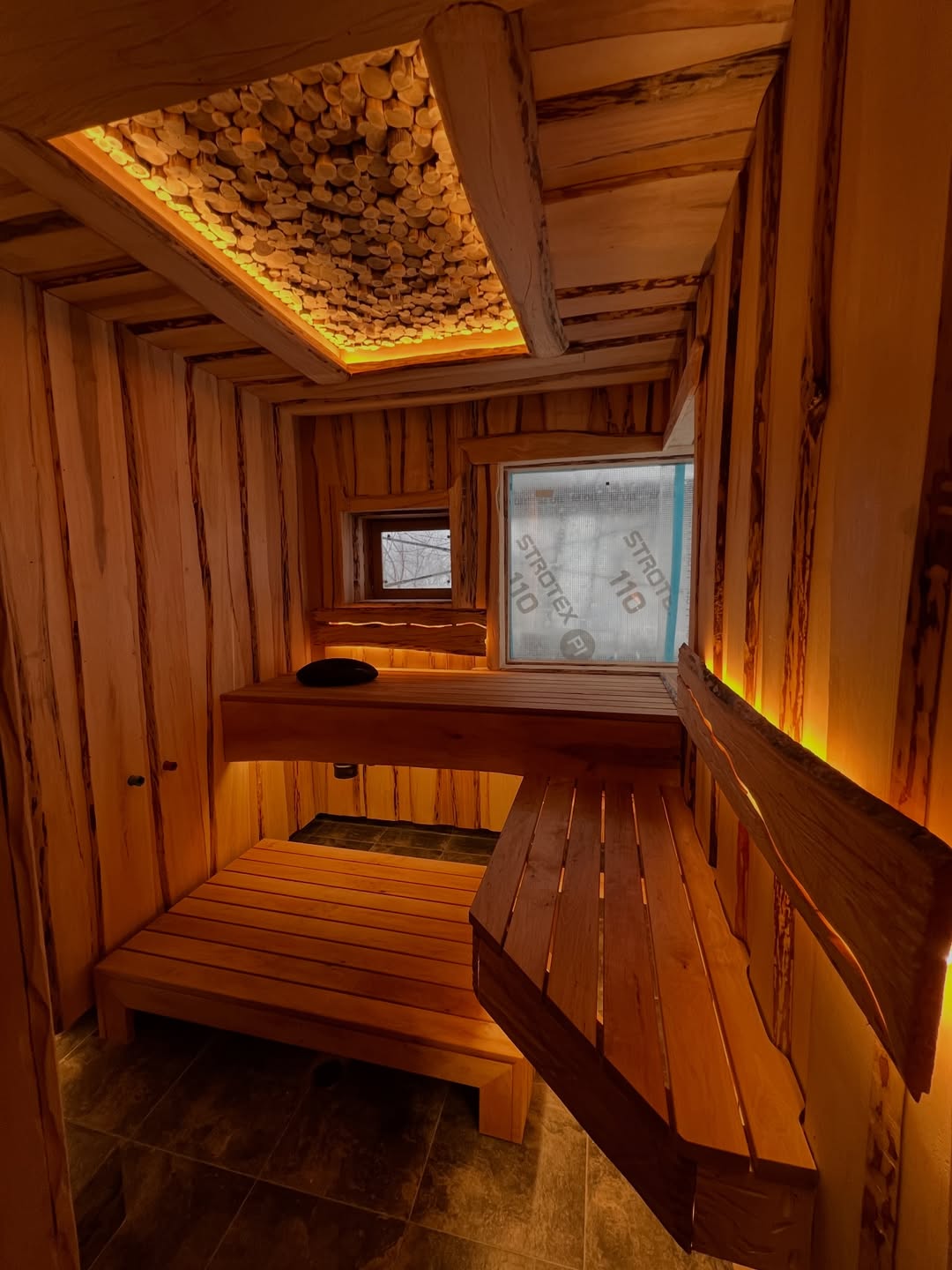 Материалы отделки:Вагонка STS из ольхи, 15*120.Вагонка реечная Мини из термо ольхи, 15*45.Полок из термо липы, 26*90.Элементы дизайна:Панно из можжевельника.Оборудование:..