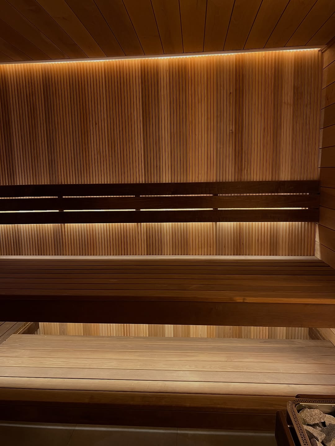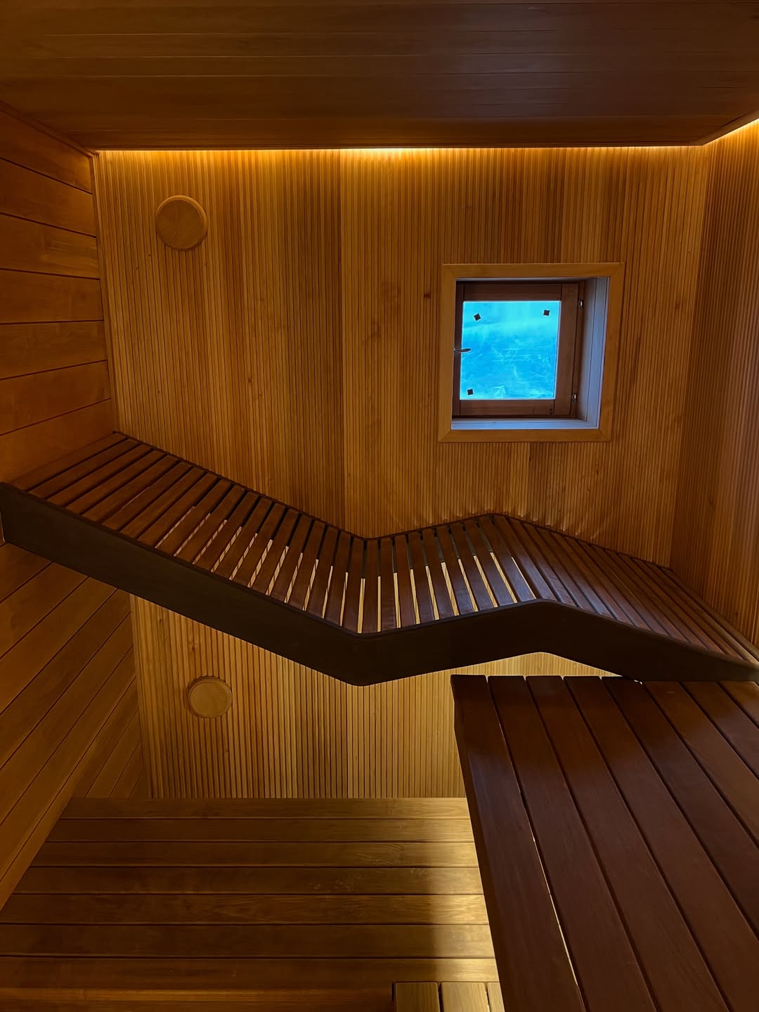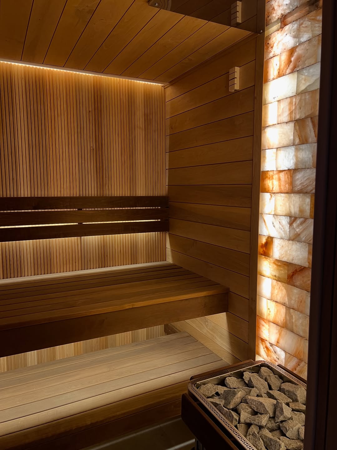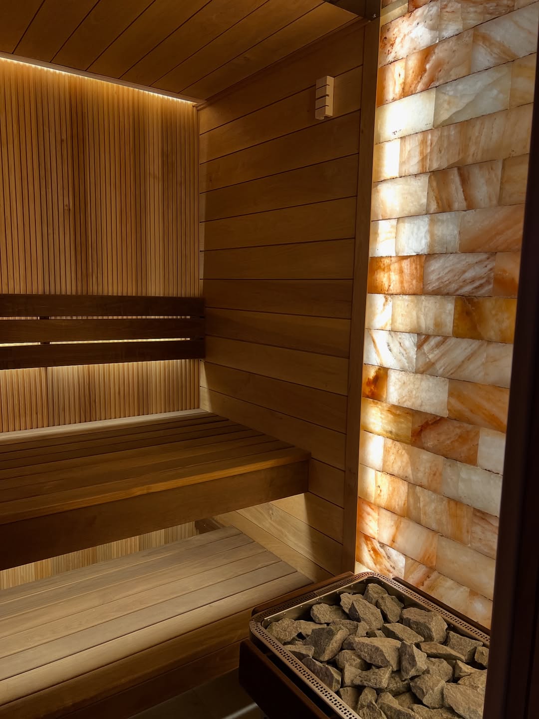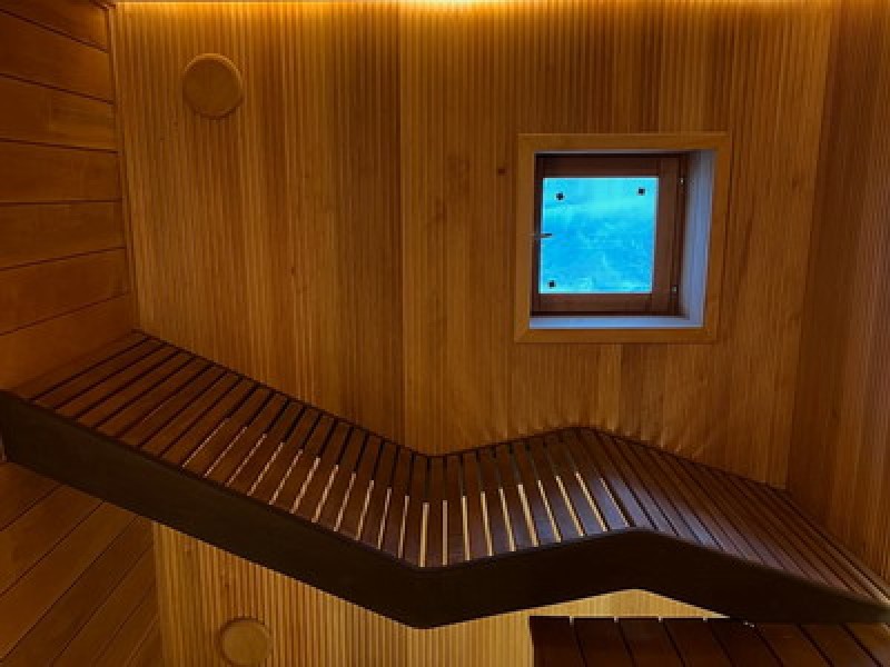 Материалы отделки:Вагонка STS из ольхи, 15х120,Вагонка реечная Лайт из ольхи,Полок из термо абаша.Элементы дизайна:Панно из можжевельника,Контурная подсветка,Плитка Тальк..