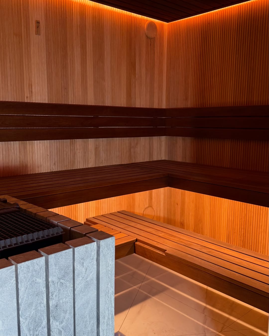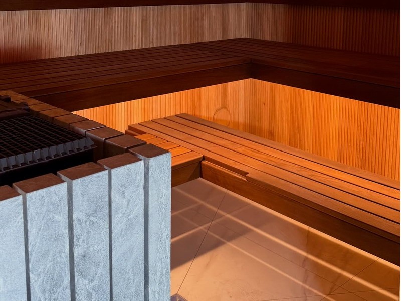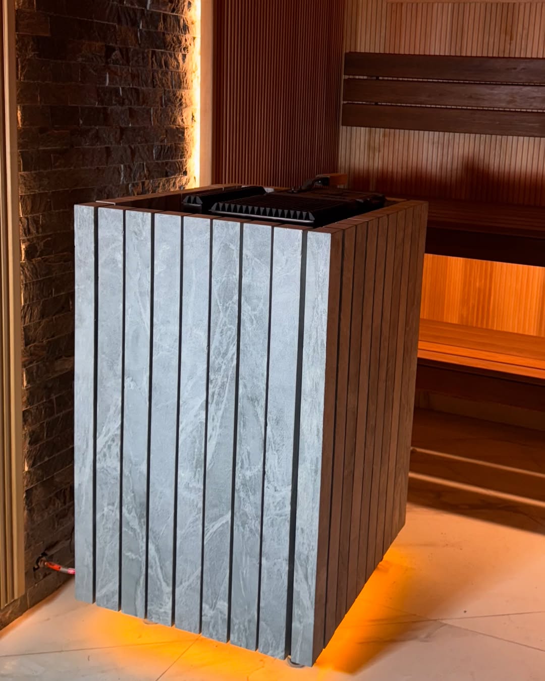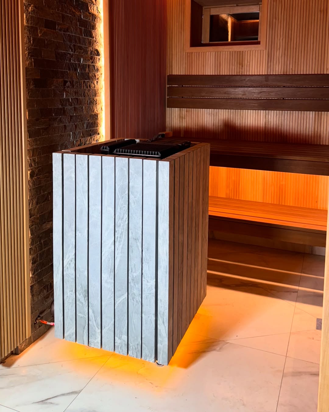 Материалы отделки:Вагонка STS из ольхи, 15/80Полок из термо липы, 26/90Элементы дизайна:Контурная подсветка.Плитка талькохлорит.Панно из можжевельника.Оборудование:Печь Я..