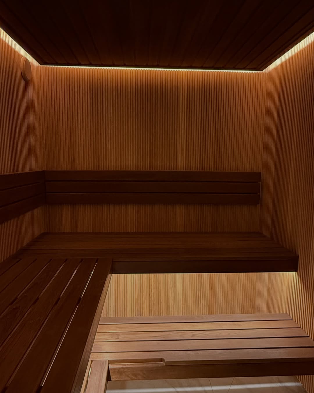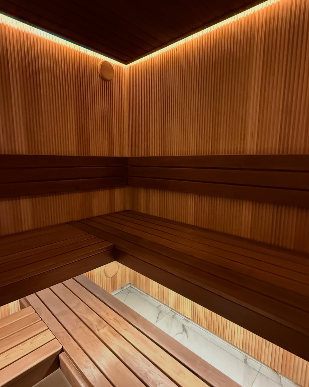 Материалы отделки:Вагонка реечная Max из ольхи, 27*45 мм.Вагонка STS из ольха, 15*120 мм.Полок из термо липы, 26*90 мм.Элементы дизайна:Контурная подсветка.Плитка талькох..