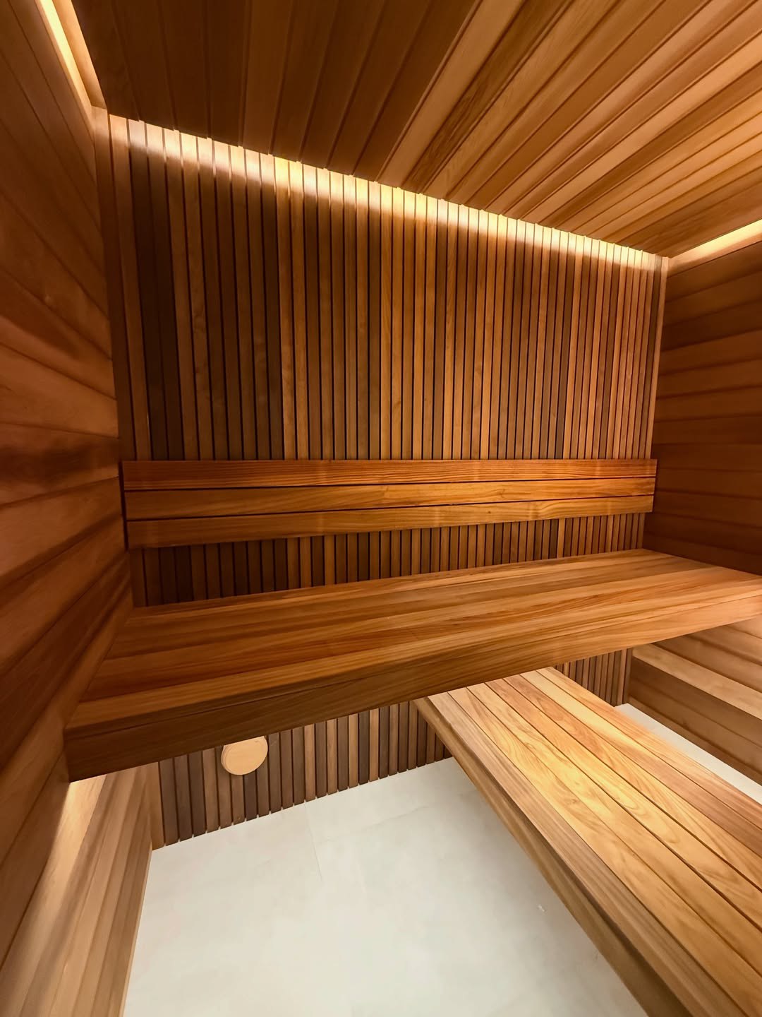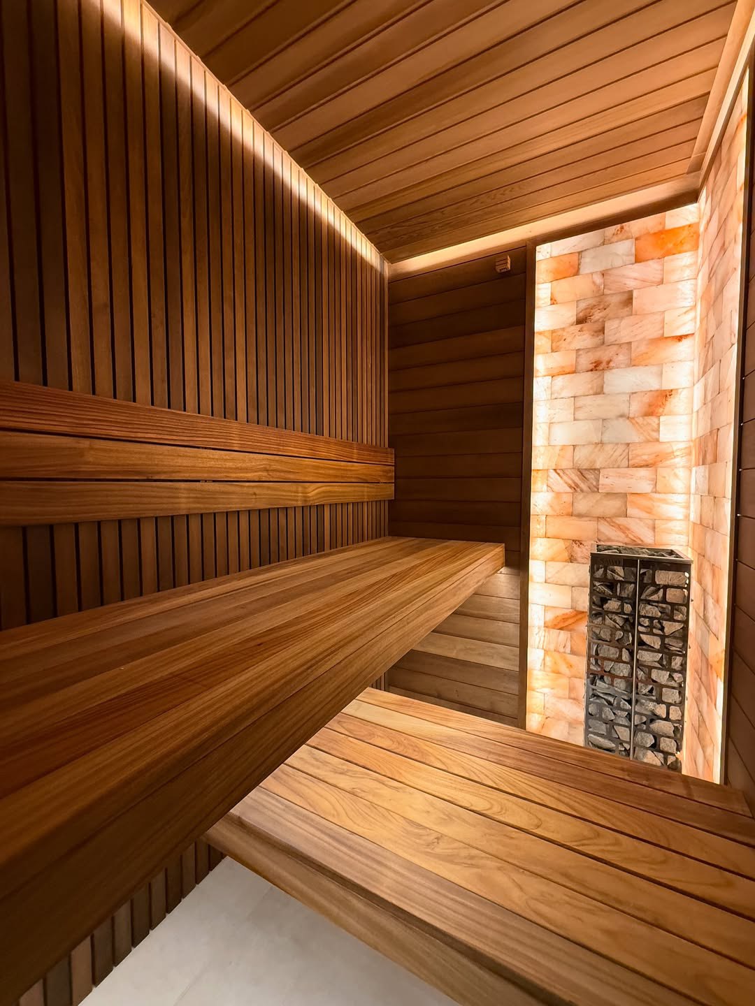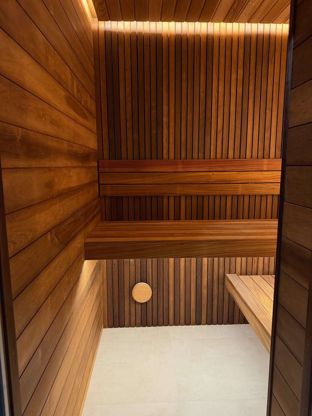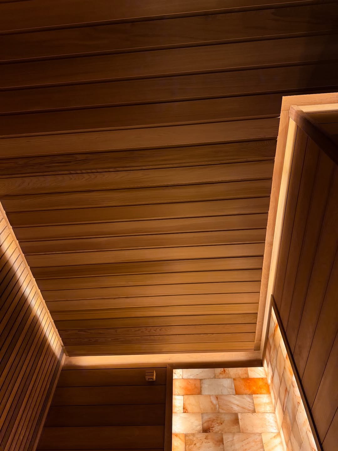 Материалы отделки:Вагонка STS из ольхи, 15х120,Вагонка реечная Лайт из ольхи,Полок из термо абаша.Элементы дизайна:Панно из можжевельника,Контурная подсветка,Плитка Тальк..