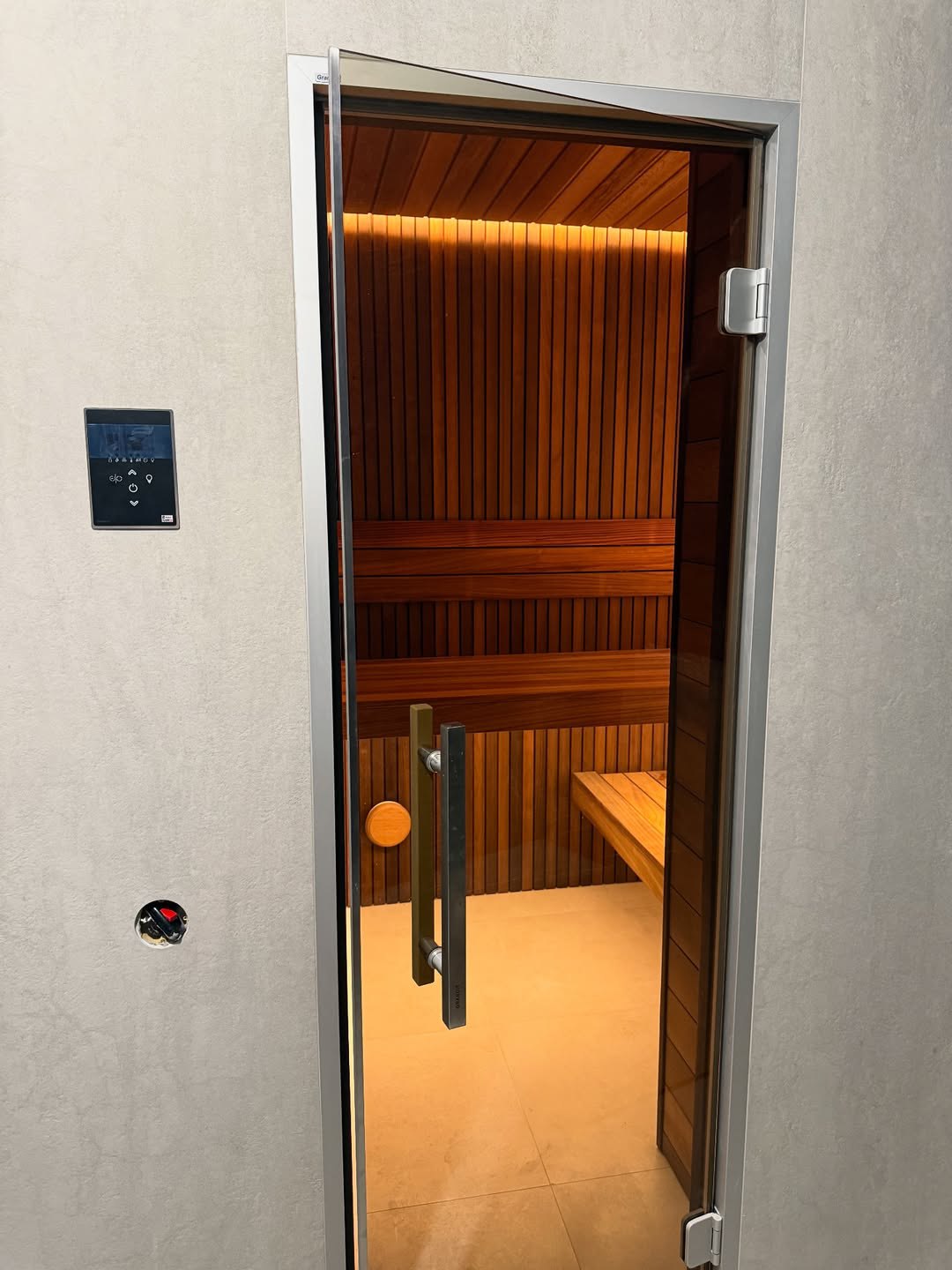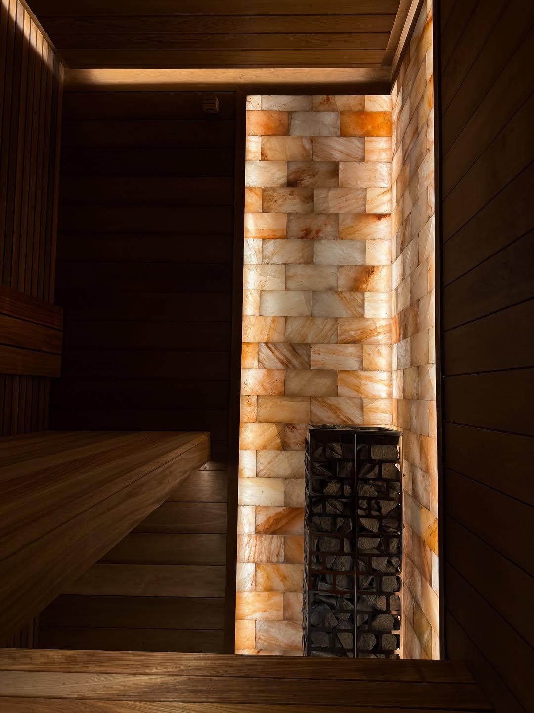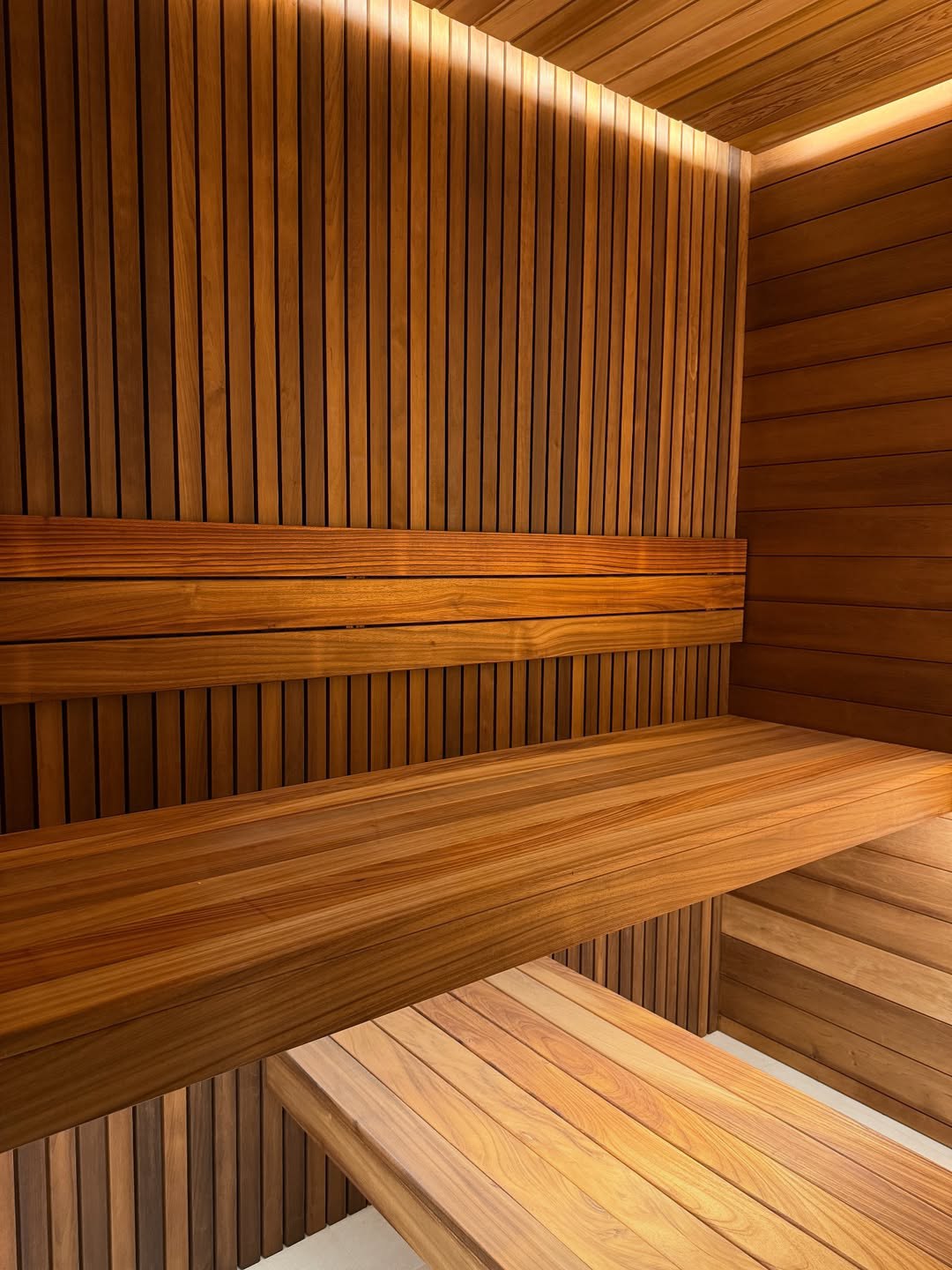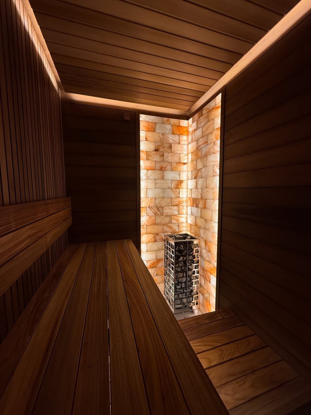 Материалы отделки:Вагонка STS из ольхи, 15х120,Вагонка реечная Лайт из ольхи,Полок из термо абаша.Элементы дизайна:Панно из можжевельника,Контурная подсветка,Плитка Тальк..