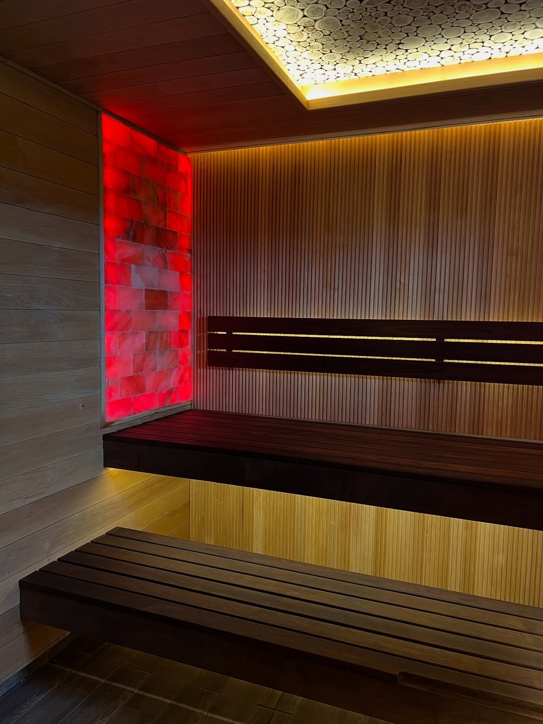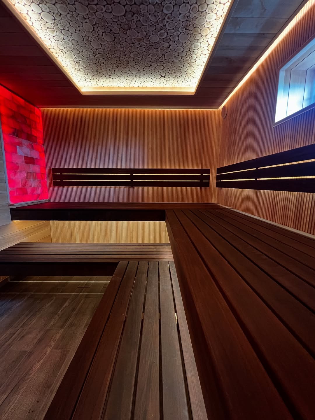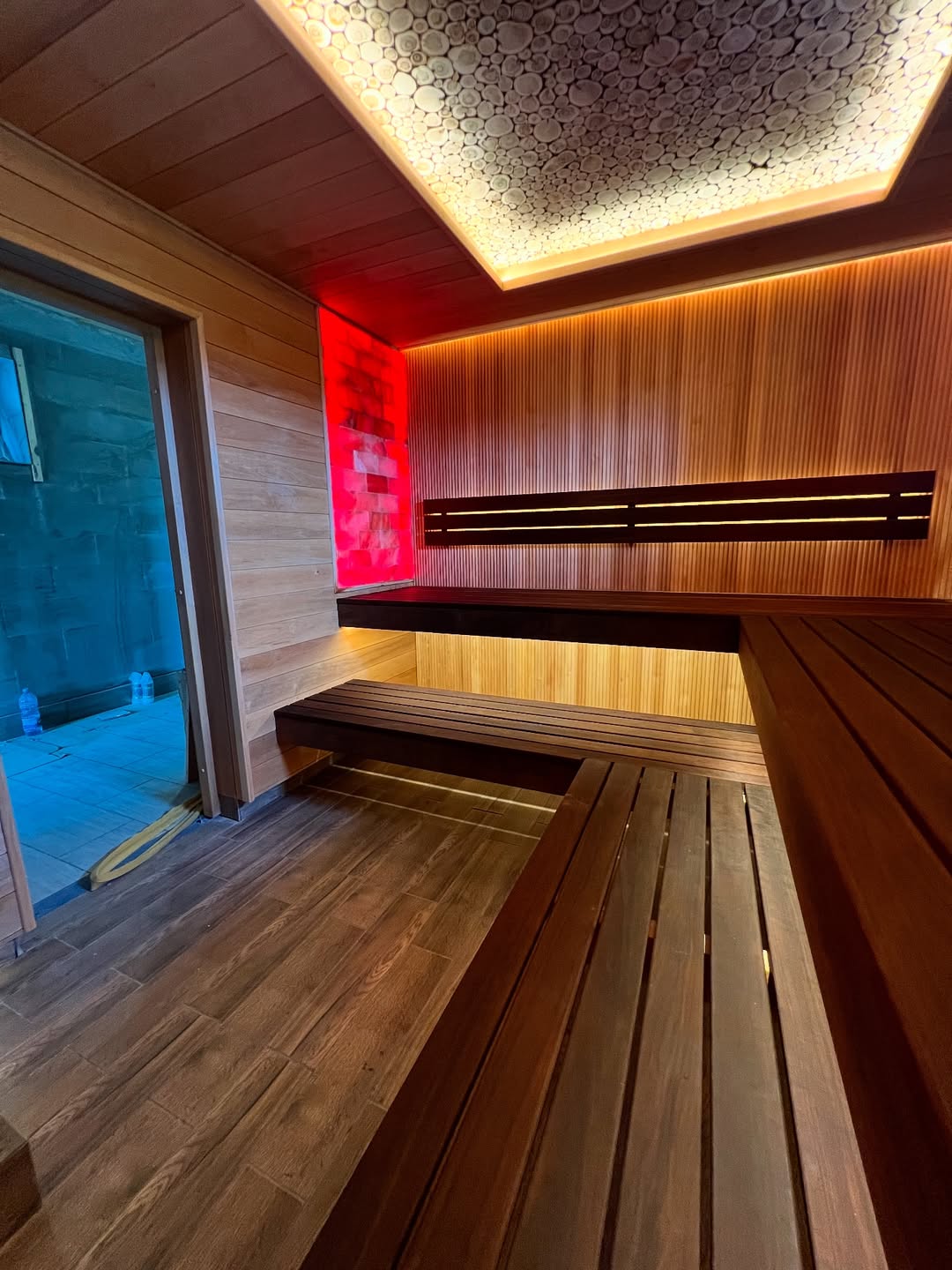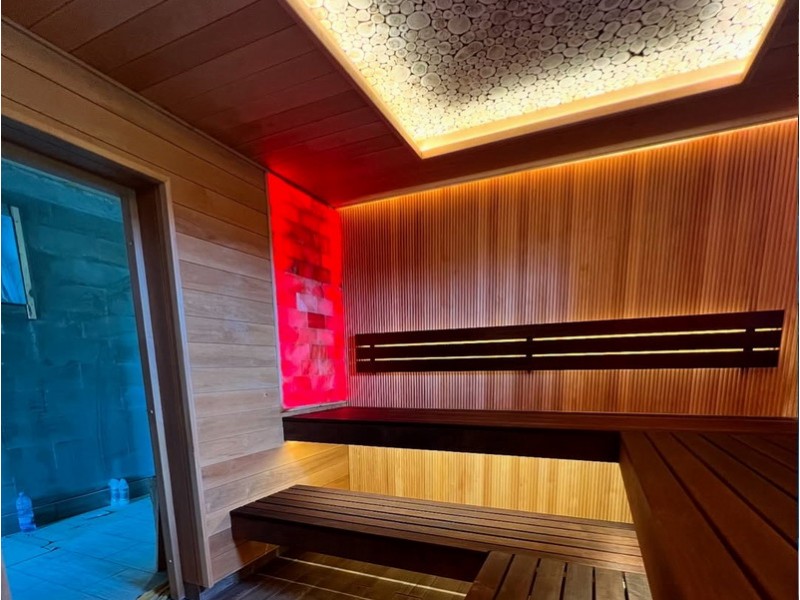 Материалы отделки:Вагонка STS из ольхи, 15*120.Вагонка реечная Мини из термо ольхи, 15*45.Полок из термо липы, 26*90.Элементы дизайна:Панно из можжевельника.Оборудование:..