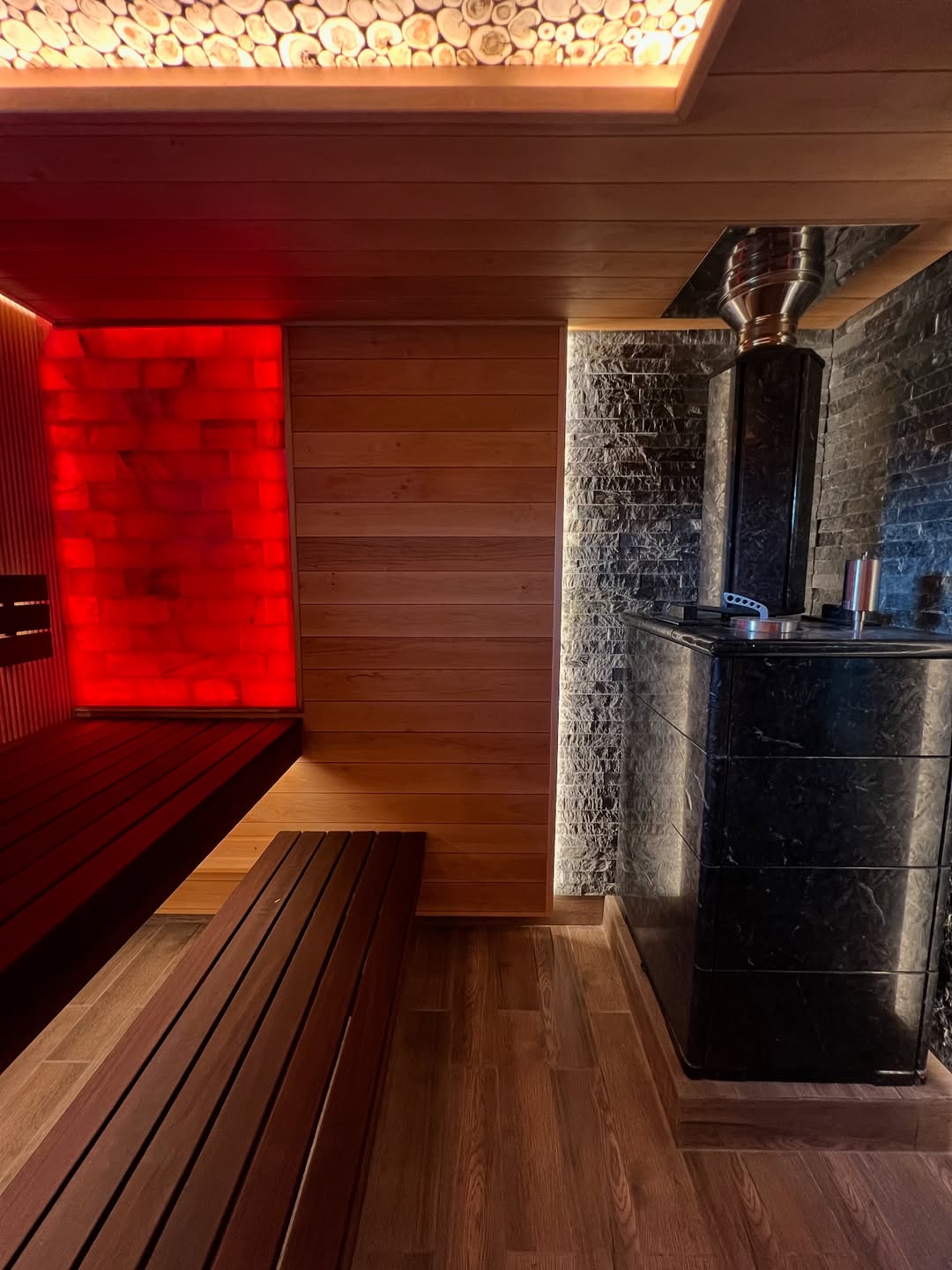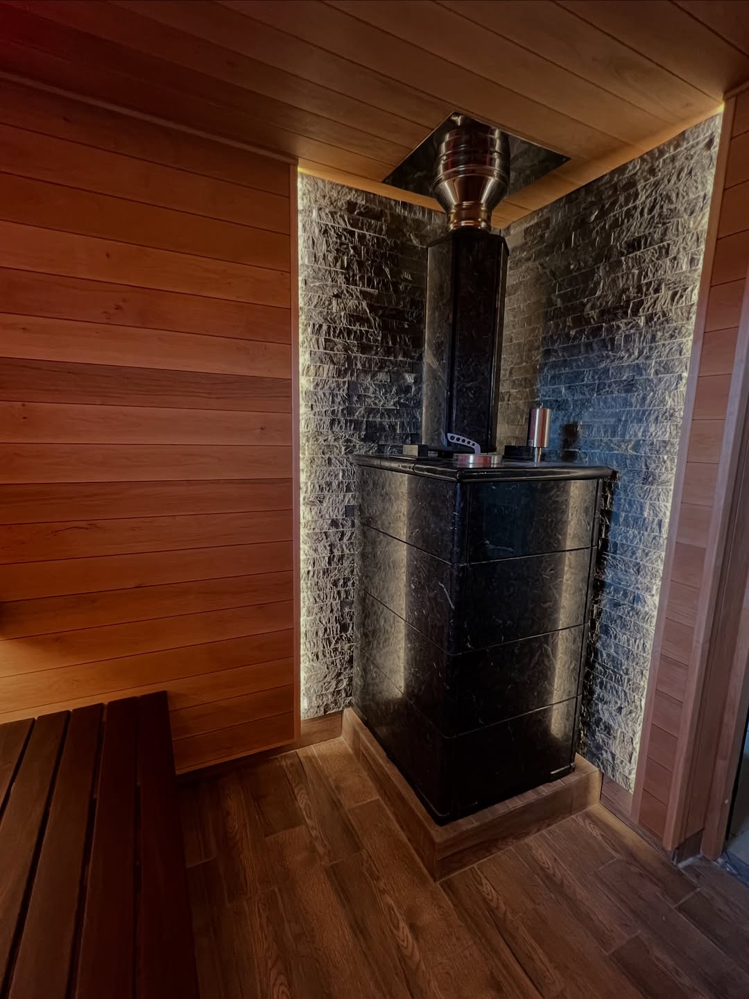Материалы отделки:Вагонка STS из термо ольха, 15/115,Полок из термо ольхи, 27/120.Элементы дизайна:Панно из можжевельника,Плитка талькохлорит за печью.